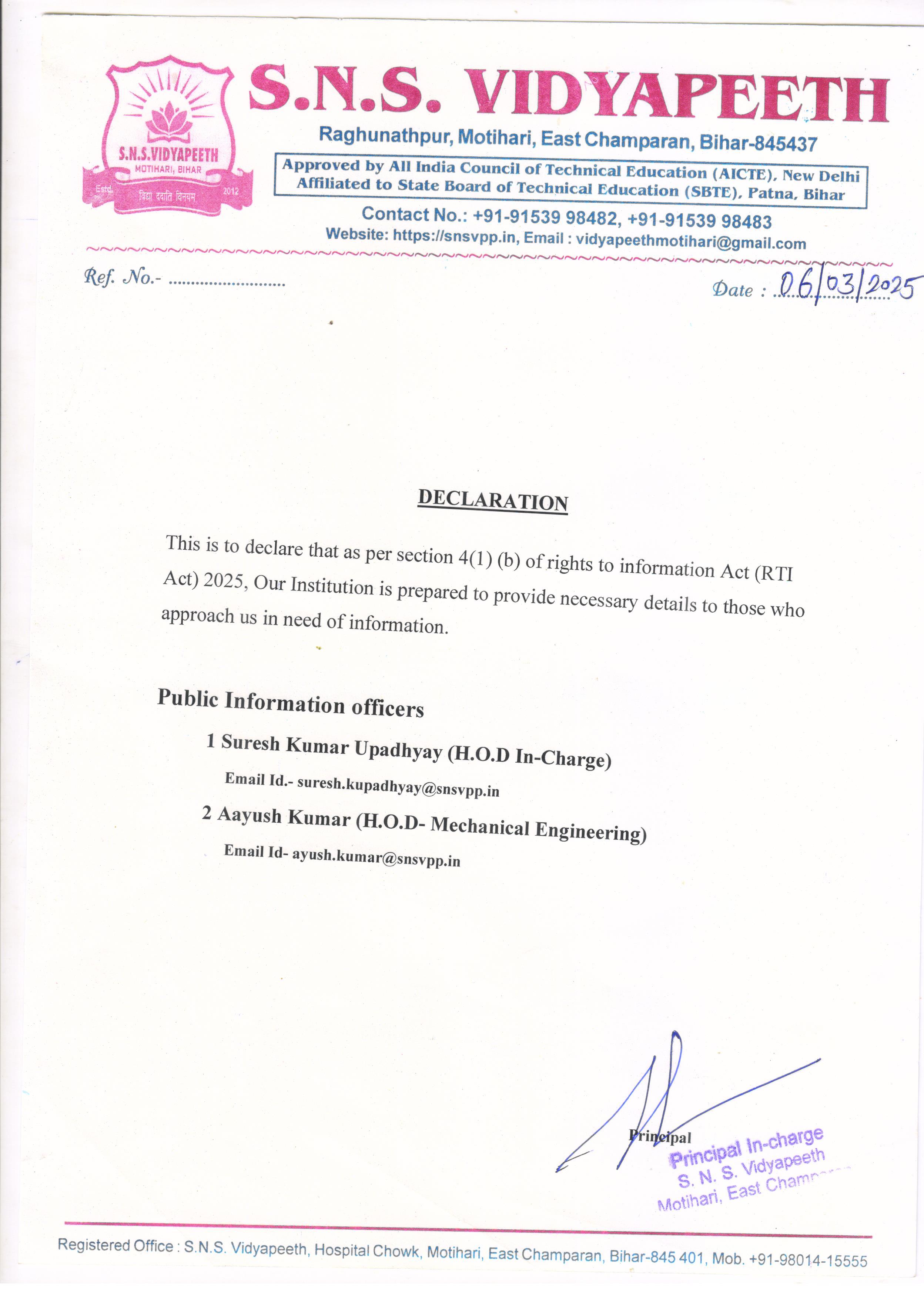Message from the desk of Principal